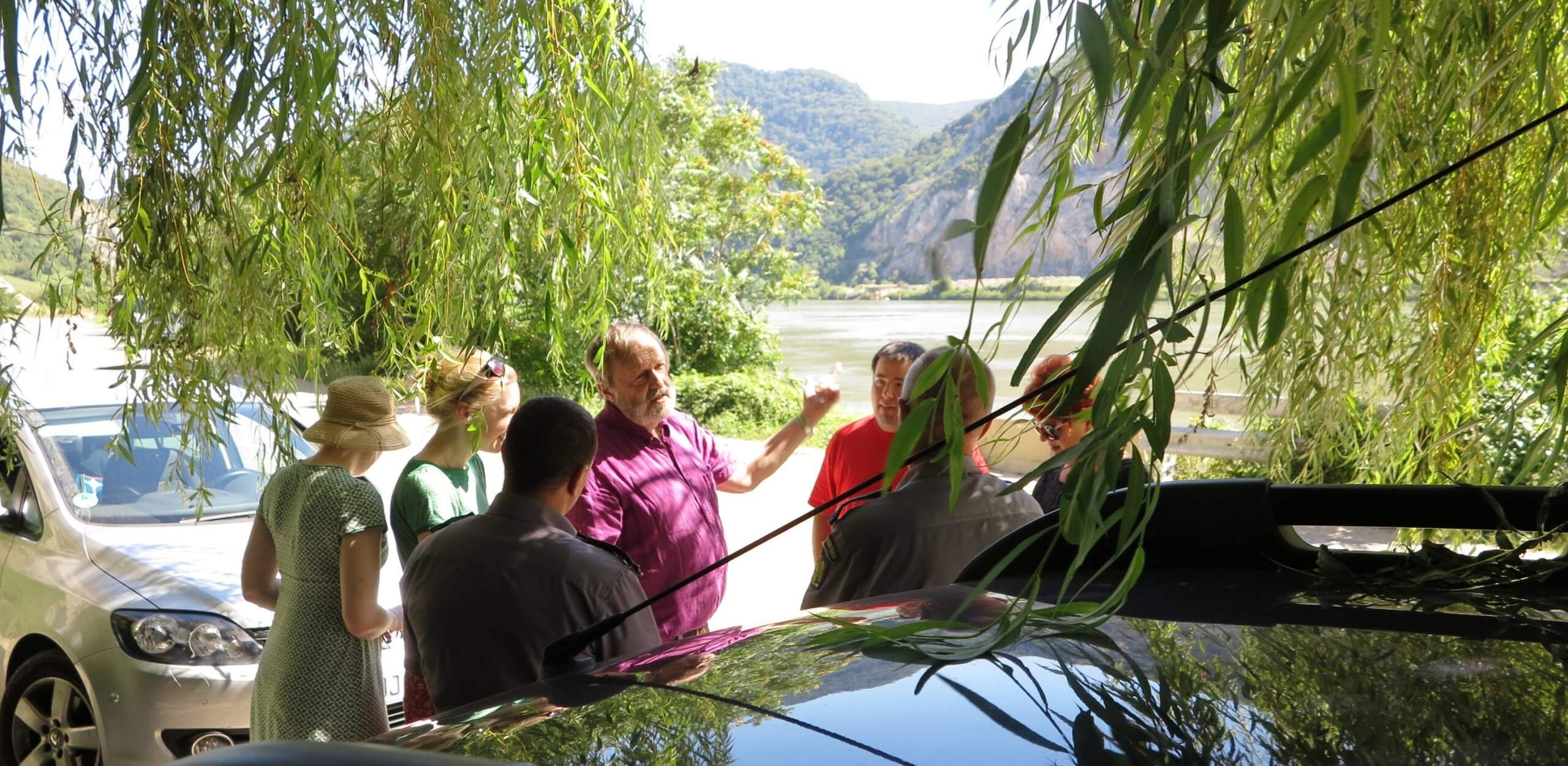Peter Mibus, înconjurat de fiicele sale, de jurnalişti şi poliţiştii de frontieră, explicându-şi aventura. Foto: Bogdan Constantinoiu